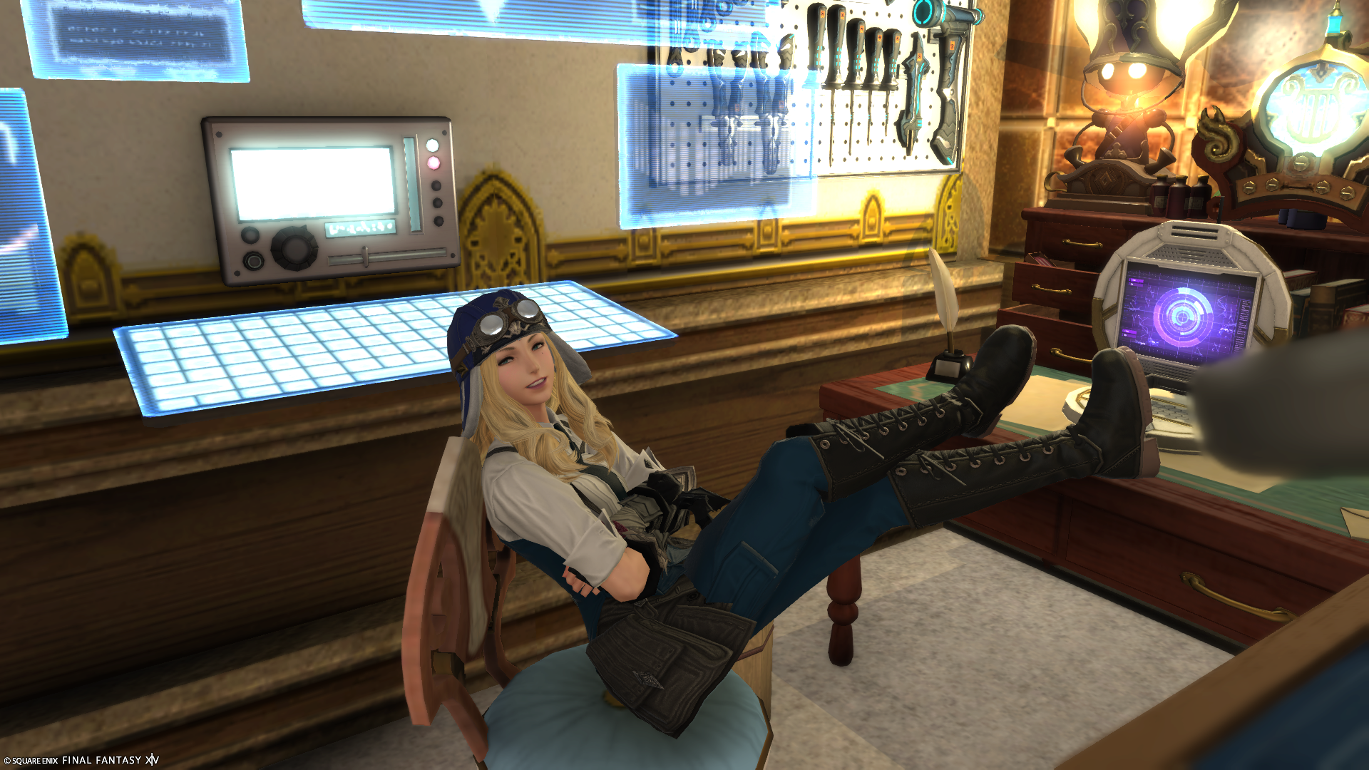 Originally an airship pilot from Garlemald, Carina one day decided that she wasn't appreciated enough in her home, so she took Nataille and enough money to rent a room and left for Eorzea, not really caring who she left behind. After joining the Ironworks and helping out with the Alexander and Omega raid series, she attempted to build a personal airship for herself that could go faster than any made before. Alas, on her first test flight, the airship crashed and she was rendered unable to walk for the better part of 2 years. (The speeder was eventually finished and given to Zeta, as per Carina's request.) Since healing, Carina learned the art of the Machinist so she could have a more direct role in Zeta's various adventures. On her most recent birthday, Zeta took Carina to Solution Nine, where they (and Nataille) became a tag-team of Arcadion fighters. Falling in love with the city, Carina chose to stay for as long as possible, eventually meeting the wayward queen Sphene, and starting a romantic relationship with her.